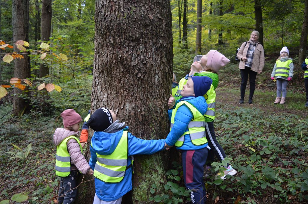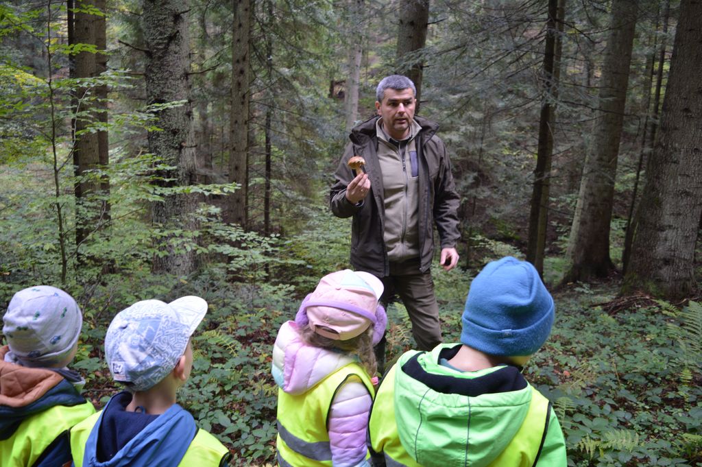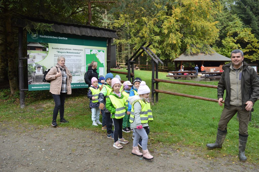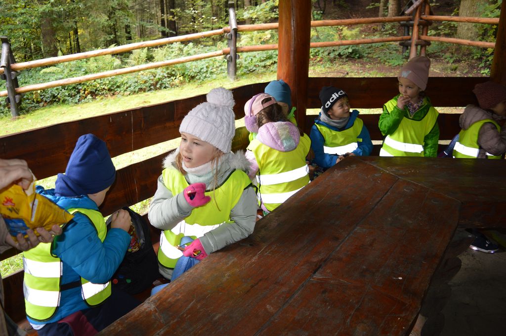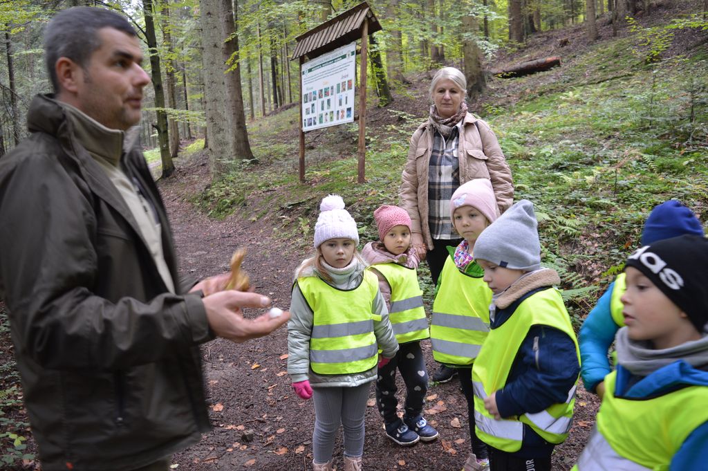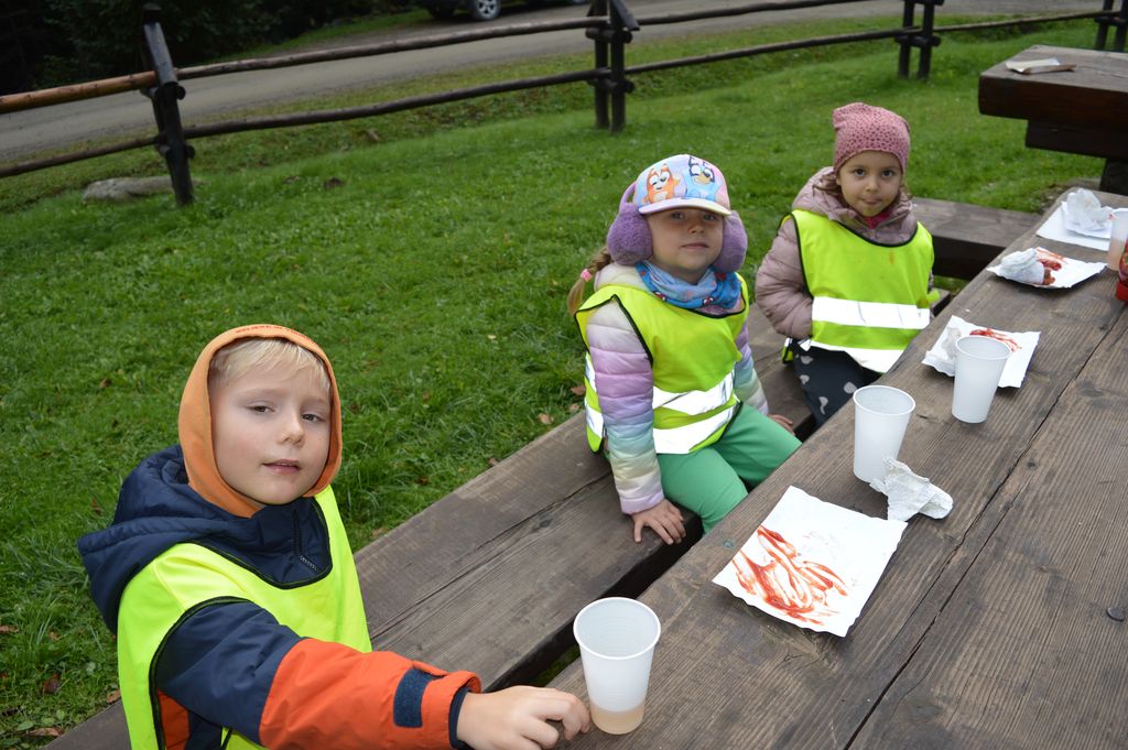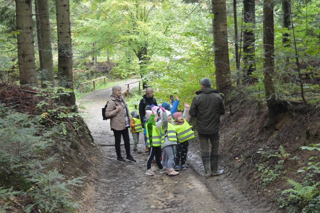 Podczas wspólnego spaceru z Panem leśnikiem dzieci poznały różne ciekawostki przyrodnicze. Na żywo zobaczyły różne gatunki drzew, dowiedziały się  jakie można spotkać w środowisku leśnym zwierzęta, podziwiały i rozróżniały grzyby. Podczas wspólnego spaceru przestrzegały również ustalone zasady zachowania się w lesie. Na zakończenie wycieczki na polu biwakowym czekały na dzieci smaczne kiełbaski z ogniska oraz słodkości przygotowane przez rodziców, które z wielkim apetytem przedszkolaki zjadły po przejściu leśnego szlaku.