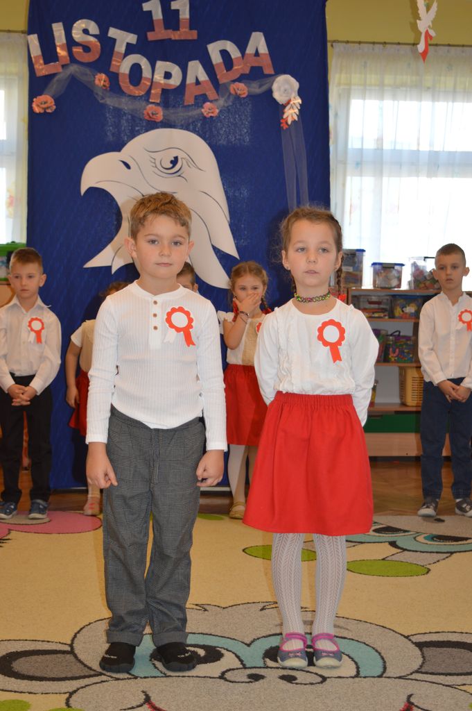 Najmłodsze przedszkolaki wzruszająco zaprezentowały wiersz Czesława Janczarskiego „Barwy ojczyste”, dzieci z grup średnich radośnie zaśpiewały utwór „Jestem Polką i Polakiem”, natomiast najstarsze przedszkolaki z powagą i zaangażowaniem wykonały pieśń „My, Pierwsza Brygada” – symbol odwagi i miłości do Ojczyzny.