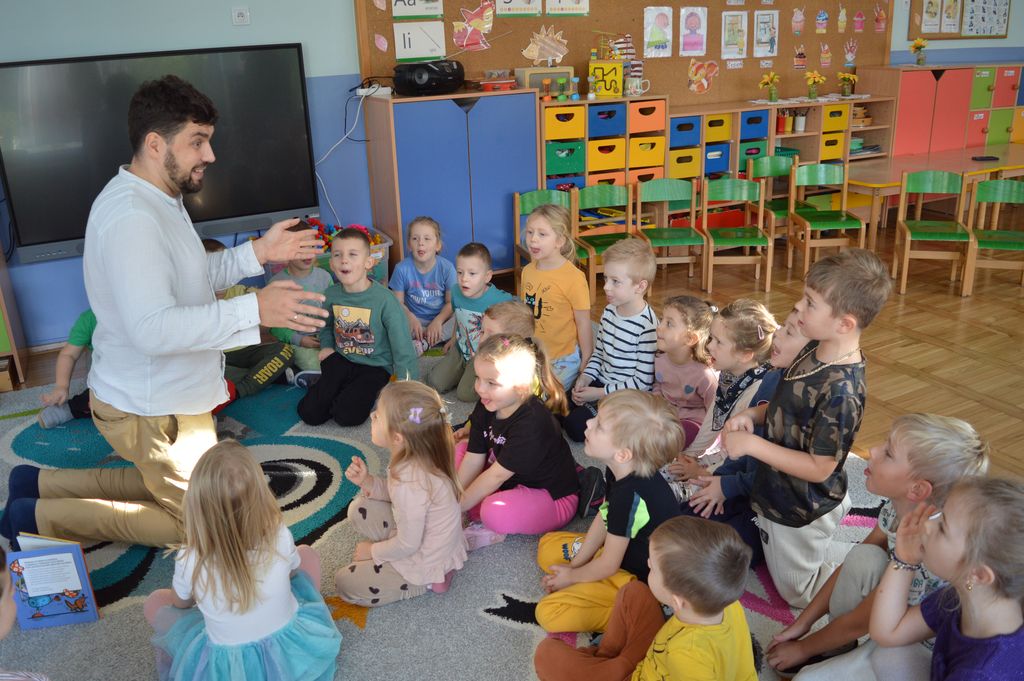 W czwartek, 13 listopada o godzinie 9.00, w Miejskim Przedszkolu nr 1 w Gorlicach odbyło się wyjątkowe spotkanie z Mateuszem Świstakiem — opowiadaczem, pisarzem, edukatorem i podcasterem, który od ponad jedenastu lat udowadnia, że moc opowieści potrafi odmienić sposób, w jaki uczymy się i poznajemy świat.